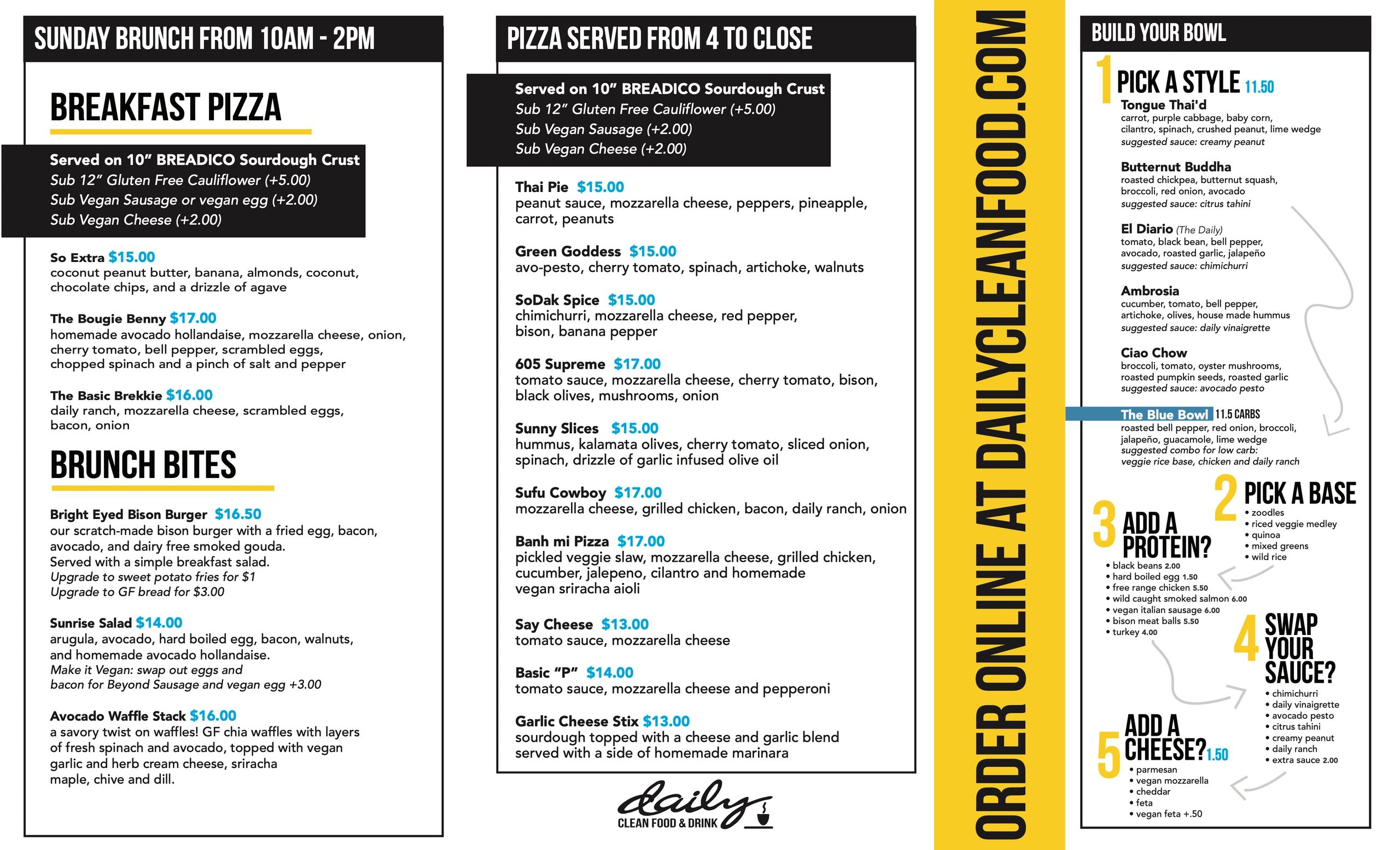 Online menu for Daily Clean Food and Drink in Sioux Falls SD - Order now. A fast casual restaurant focused on organic clean foods for a wide range of diners and dietary needs. 6215 S Western Ave Sioux Falls SD 57108-3403 1 605-271-1736 Website Menu Add hours.